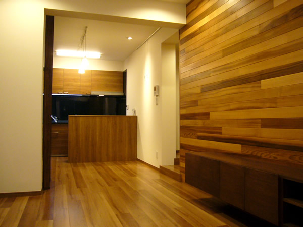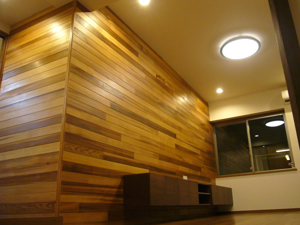 リビングのリニューアルに際して、壁面のアクセントにレッドシダーの無垢板を使いました。
