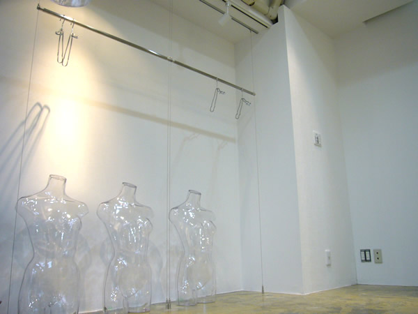 わずか5坪の小さなアパレルショップです。こちらのセレクトされた商品は、個性的なデザインが特徴です。その為、店内のデザインは極力シンプルにし、商品のデザインが際立つように考えました。店内中心部分には、透明アクリルのマネキンを天井から吊り下げて洋服が浮遊して見えるような演出をしました。