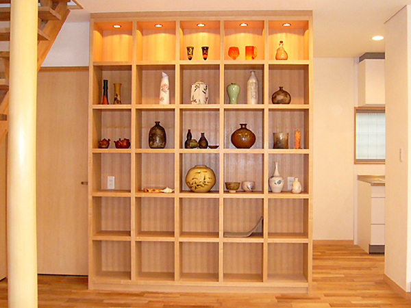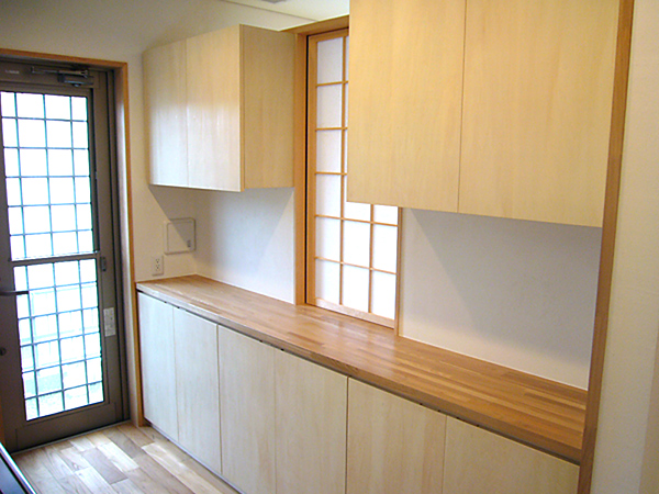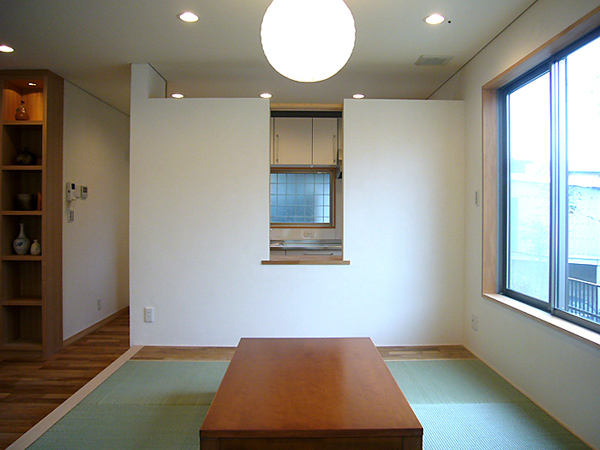 和風モダンをコンセプトとした、広々としたリビングダイニング。そのため、思い切って「玄関」という機能を無くし、「土間」としてリビングに組み込み、庭と室内の中間領域を構成しました。家族団らんを求めた空間です。